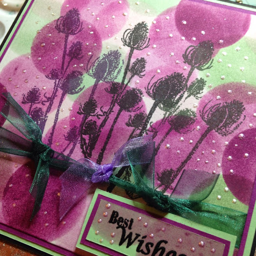 I made my own mask for this using a piece of chipboard and cutting out a small circle. I then sponged on my dots using spun sugar, seedless preserves and bundled sage distress inks. With the image stamped three times in three different inks I added liquid pearls, a smidge of glitter and garnished with a sentiment and ribbon.